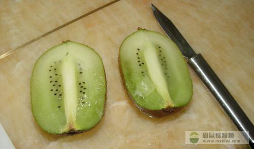 2,用小刀把猕猴桃切成两半。如果猕猴桃本身已经有些许软化,最好用薄一些,快一些的刀,避免切割过程中果体变形:)